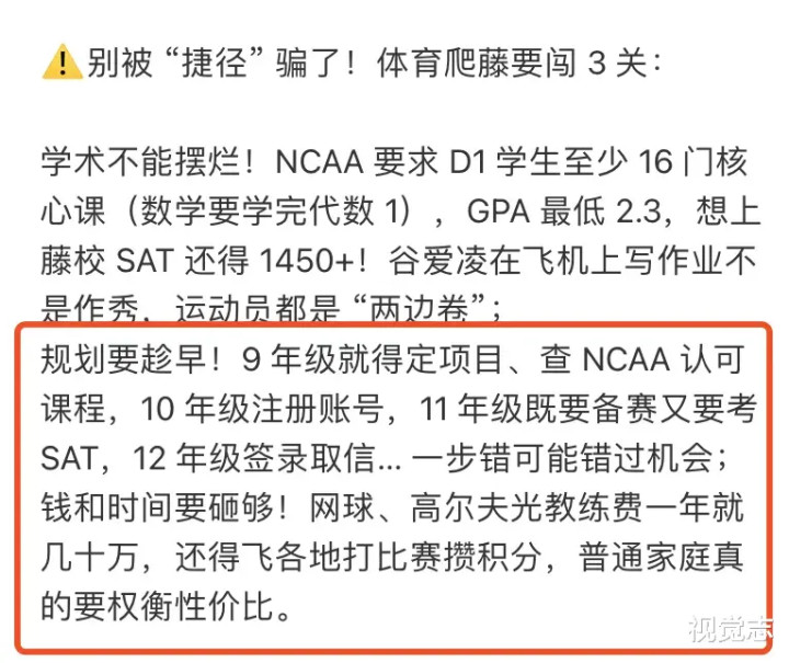 但这条路并不“快捷”,如果要走体育“爬藤”这条路,等到高中再开始就晚了,“9年级定项目、查NCAA 认可课程,10年级注册账号,11年级既要备赛又要考 SAT,12年级签录取信……”