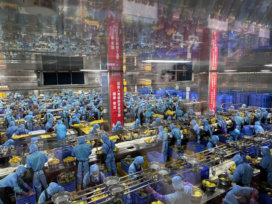 蜜雪冰城广西生产基地。在芒果初加工车间,500多名工人每天可处理近100吨芒果。摄影:李艳艳
